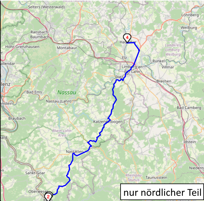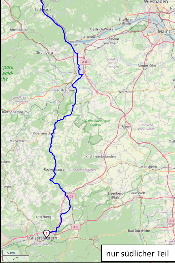 Strecke ca. 160 km, Fahrtzeit ca. 2:15 h (mit Rheinüberquerung mit Fähre Lorch oder Kaub)